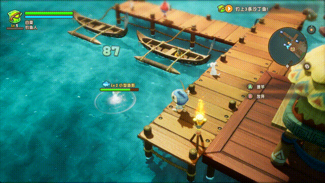 采集类职业都设计了一套“甜点”弱点机制。除了钓鱼外,像采集木头和矿石基本上都是锁定单个职业,然后进行360°环绕寻找弱点。一旦找到弱点,就能够快速消耗采集物的血条。同时,蓄力攻击和偶尔出现的双倍暴击等设计,能够不断增强玩家的正反馈体验,使原本枯燥的采集玩法增添了不同的乐趣。
