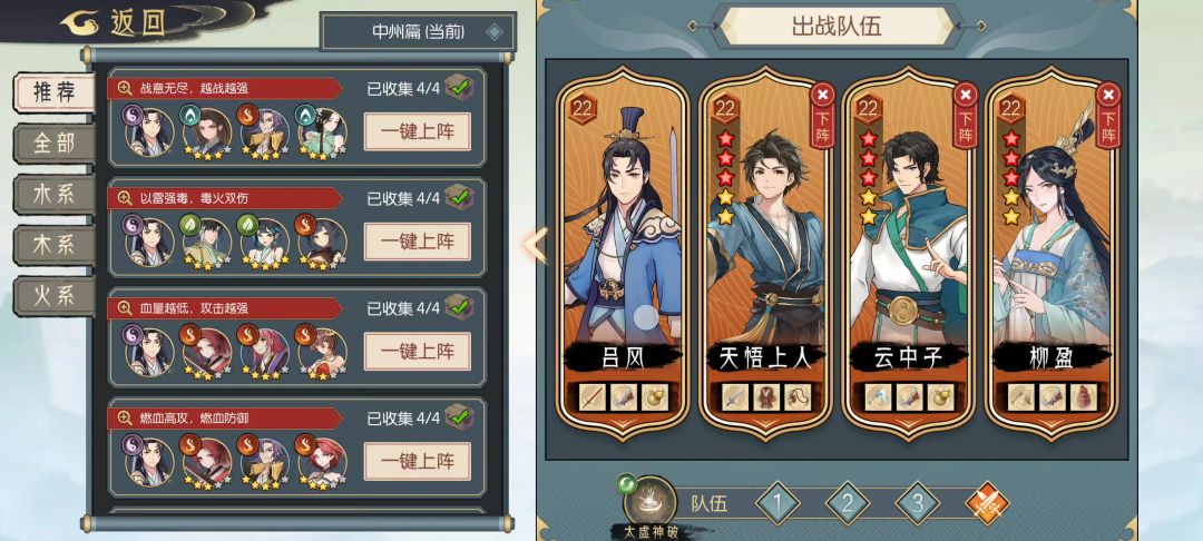 第一回合:云中子打出百转叠浪诀、三清化水符和玄冰化刃符,吕风复制玄冰化刃符并打出,柳盈打出玄冰神破、玄冰九变和化刃符,先击杀速攻木桶怪,如果可以,再击杀威能木桶怪。