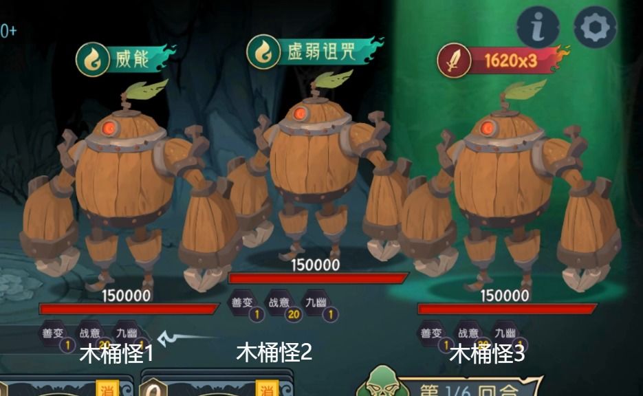 第一回合开始时木桶怪1/2/3分别动作为【速攻】/【威能】/【虛弱诅咒】循环
