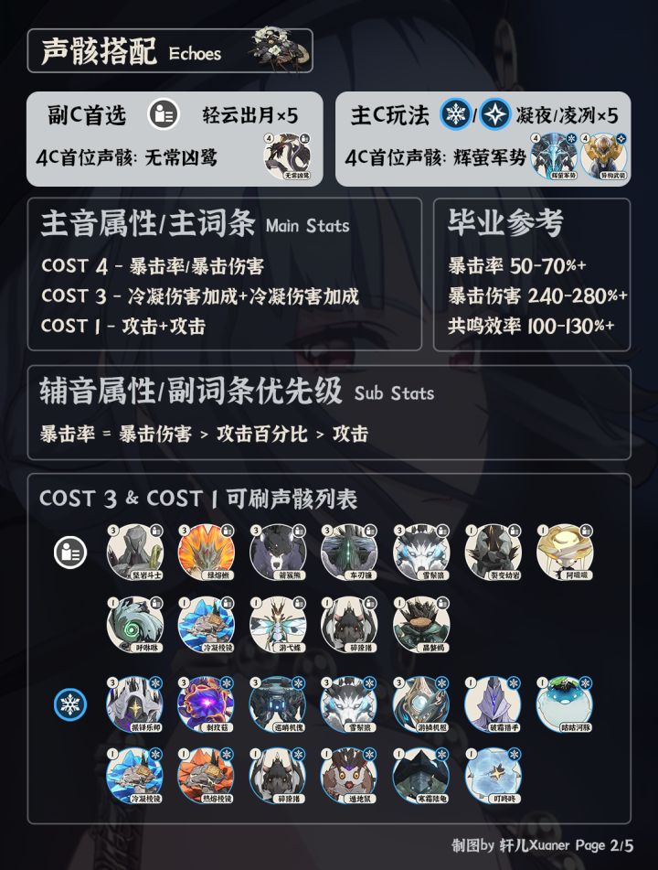 ④ 散华声骸首选轻云出月。散华自身协奏较快,无需太多共鸣效率,可以根据自己队伍实操情况调整。如果你想另辟蹊径,5/6链散华主C或轮切C,那可以考虑新老冰套都可以。