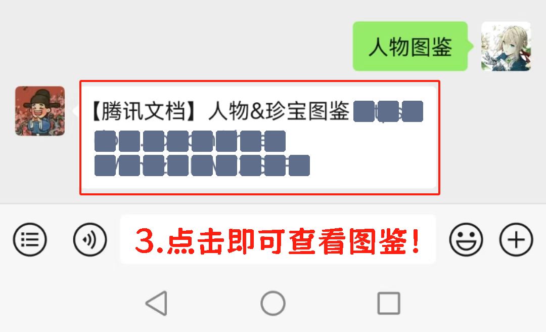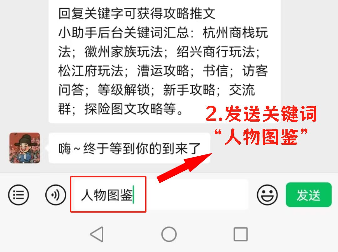 2.发送关键词“人物图鉴”;