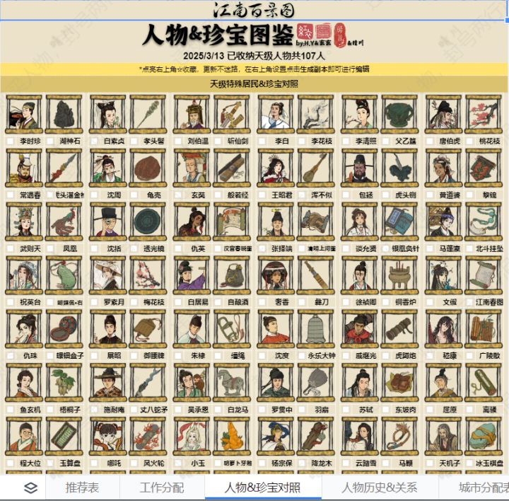 “人物&珍宝图鉴”分为五个板块:推荐表、工作分配、人物&珍宝对照、人物历史&关系、城市分配表。