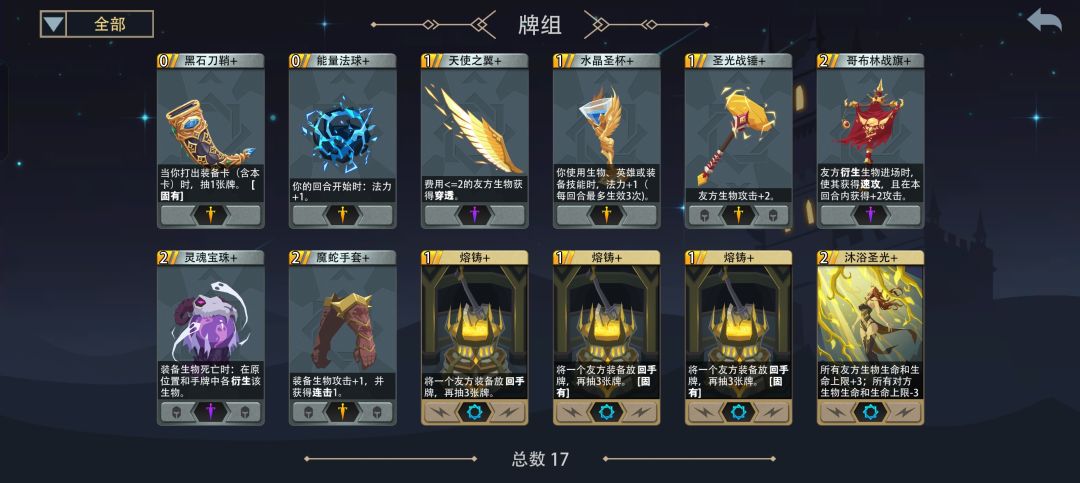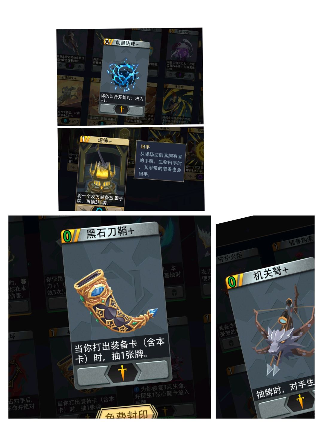 利用熔铸,把刀鞘送回手,再抽三张卡,刀鞘入场又是一张卡=1费4抽。能量法球和机关弩可以做备用,毕竟那么大的装备库,拿到需要的装备还是有点难的