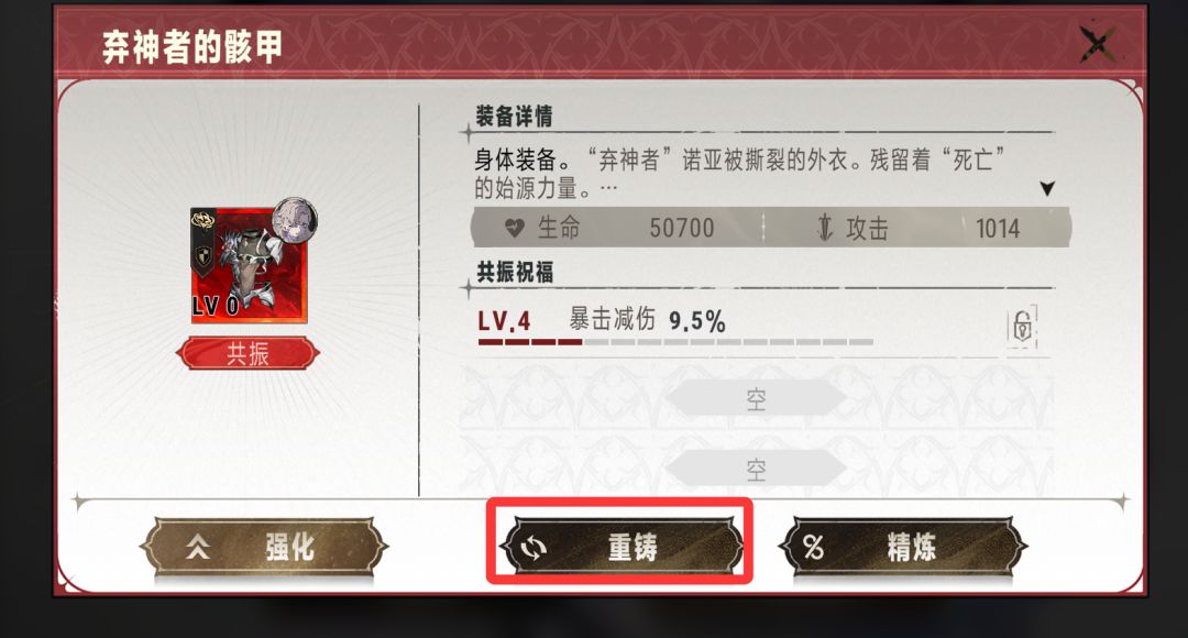由于共振、重铸、精炼都是振魂之击,建议优先级为共振(核心装备)→重铸→精炼→锁定(精炼操作)。建议大家将资源优先用于共振,主力眷属都进行共振后,多余的资源再进行重铸、精炼操作。