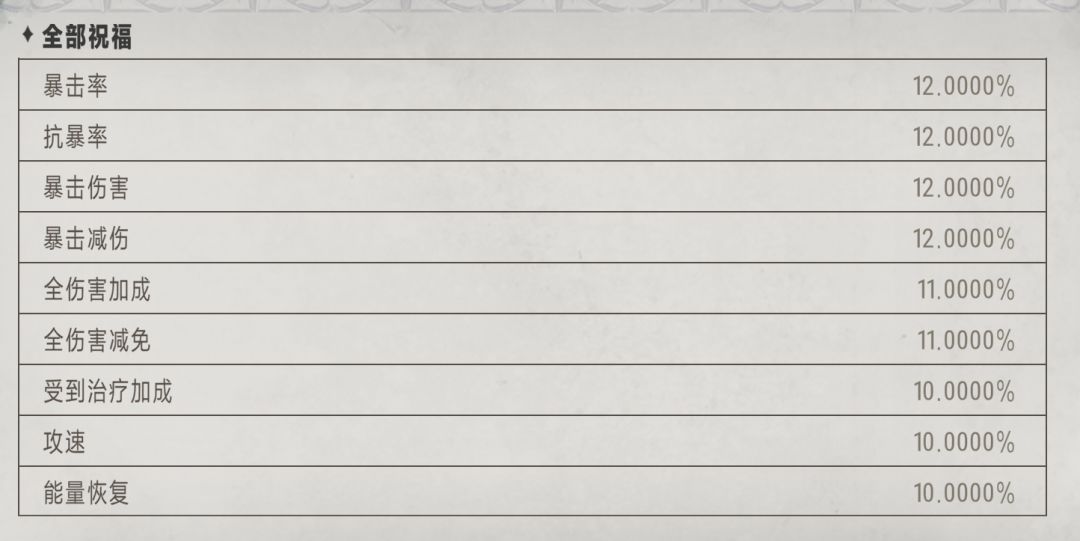 以上为可获得的全部祝福及概率,祝福要先进行栏位判定,每个栏位独立检定(可能栏位2没判定成功,但栏位3判定成功)。栏位判定成功在进行祝福判定。