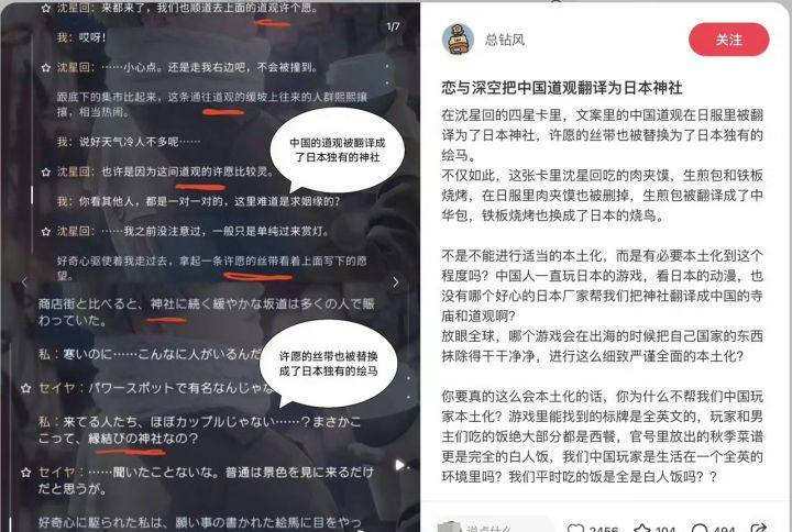 核心问题:日服剧情将国服“中国道观”译为“日本神社”,许愿丝带替换为日本“绘马”;中式餐点(肉夹馍、生煎包)被改为日式烧鸟或西式快餐。