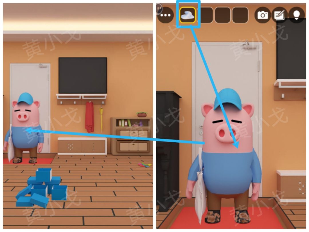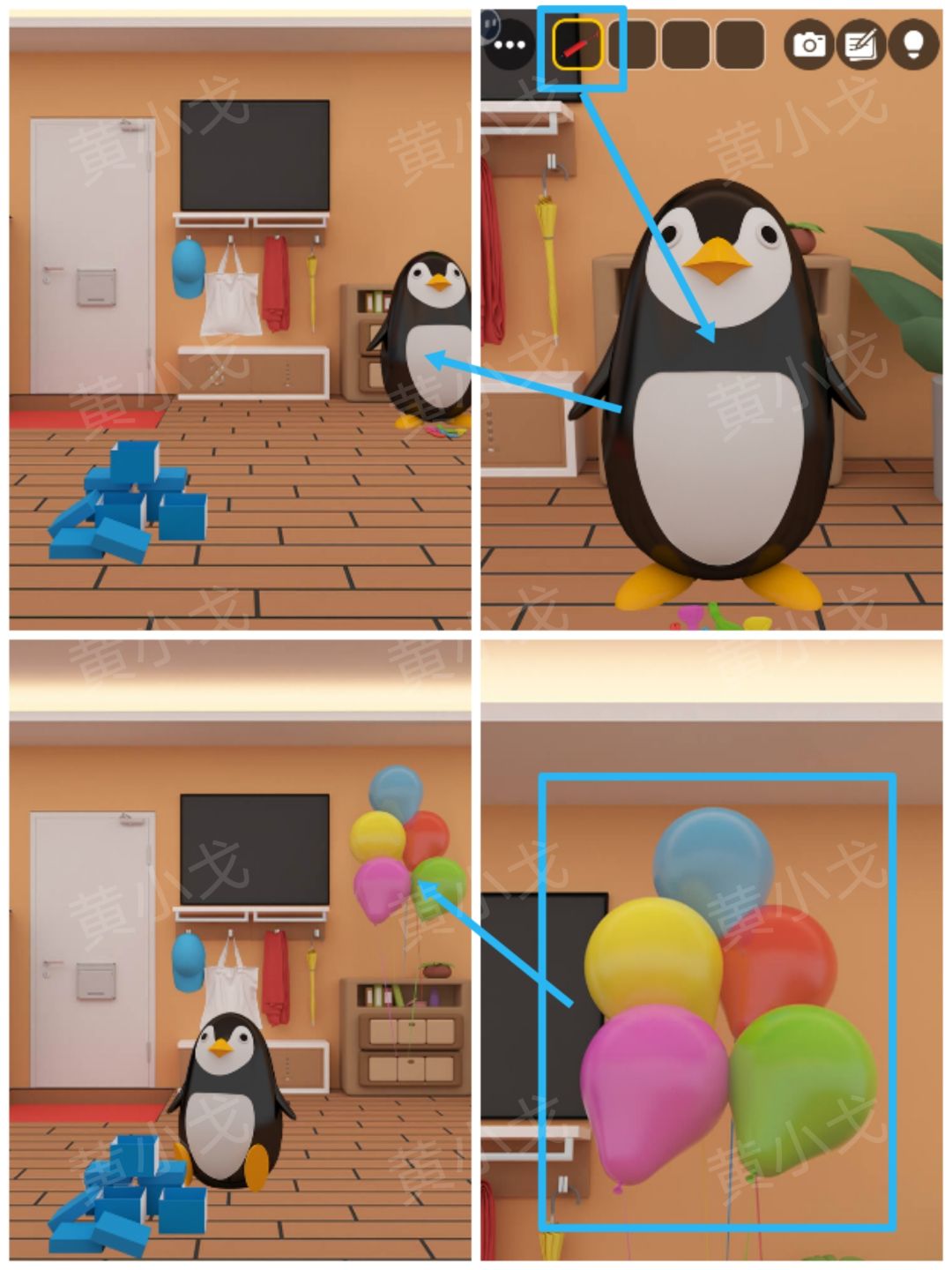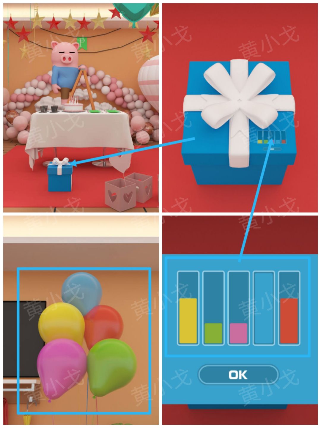 26.点击地上的礼物盒,根据上面的颜色提示,结合[玄关]场景企鹅打好的气球颜色及高度线索,调整密码锁