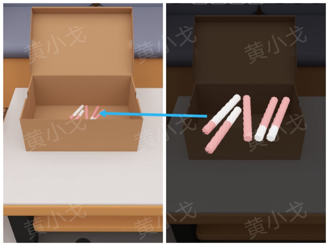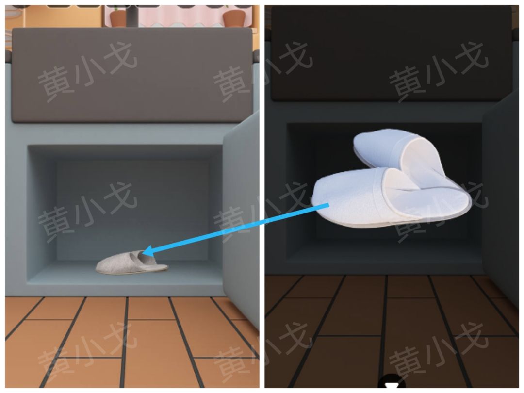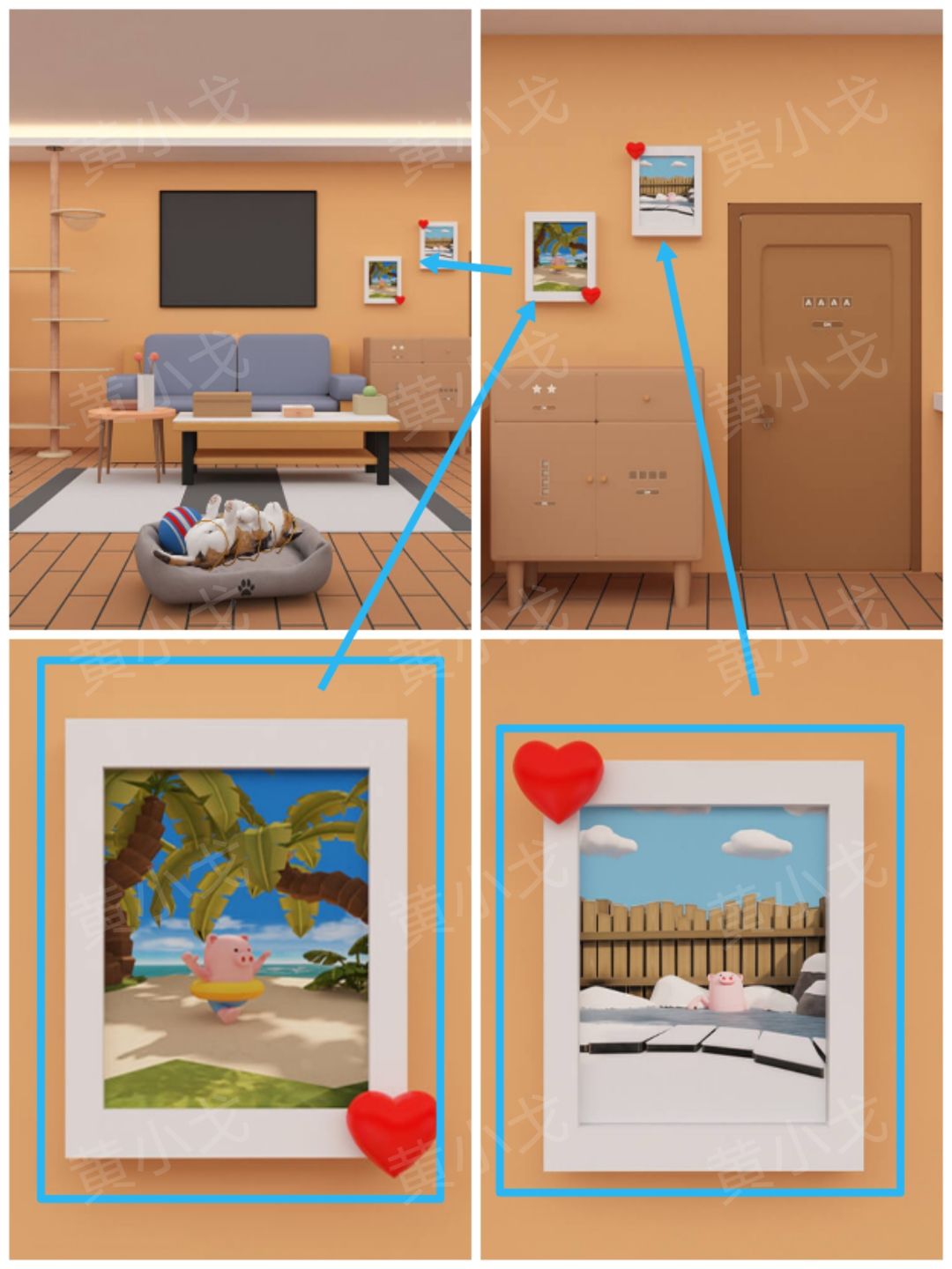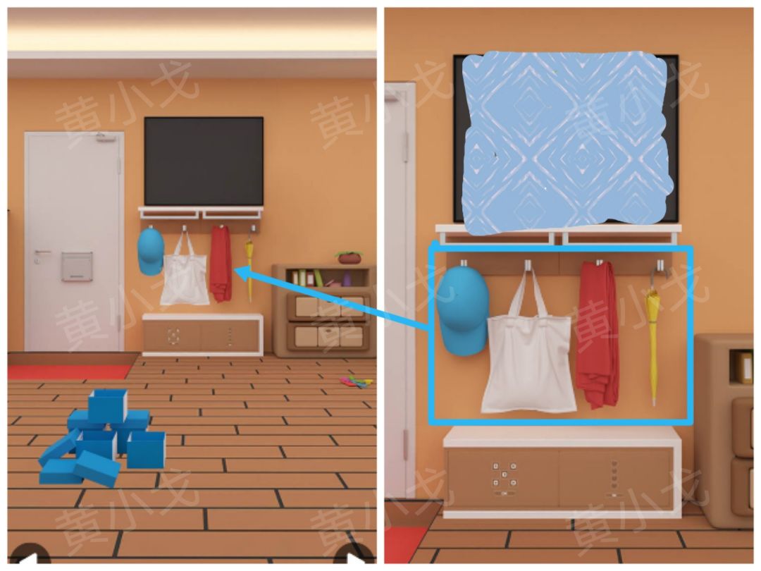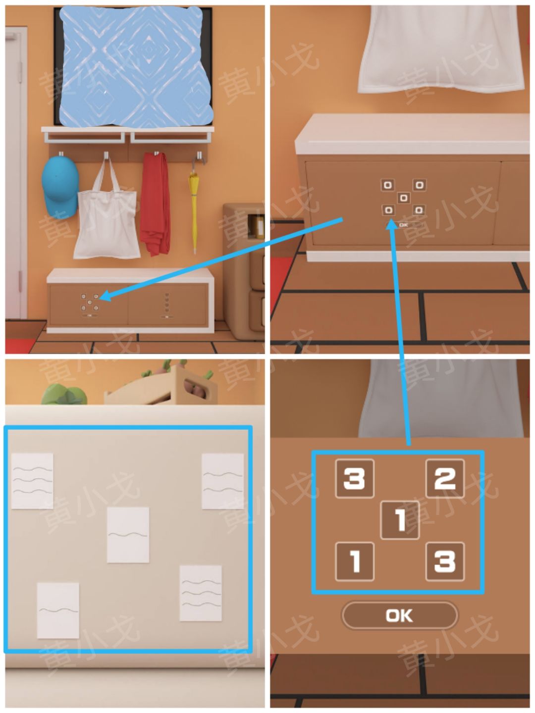 11.点击桌子上的纸盒,根据[玄关]场景挂钩上的物品颜色线索,调整密码锁
