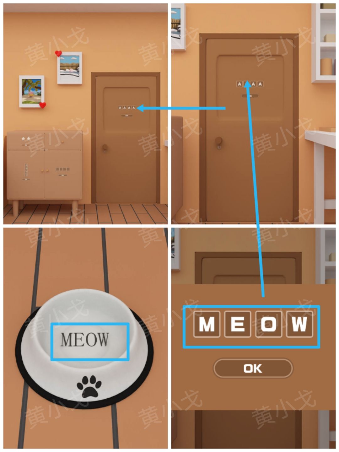 29.点击门上的密码锁,根据猫碗中的单词,输入密码:MEOW,打开门