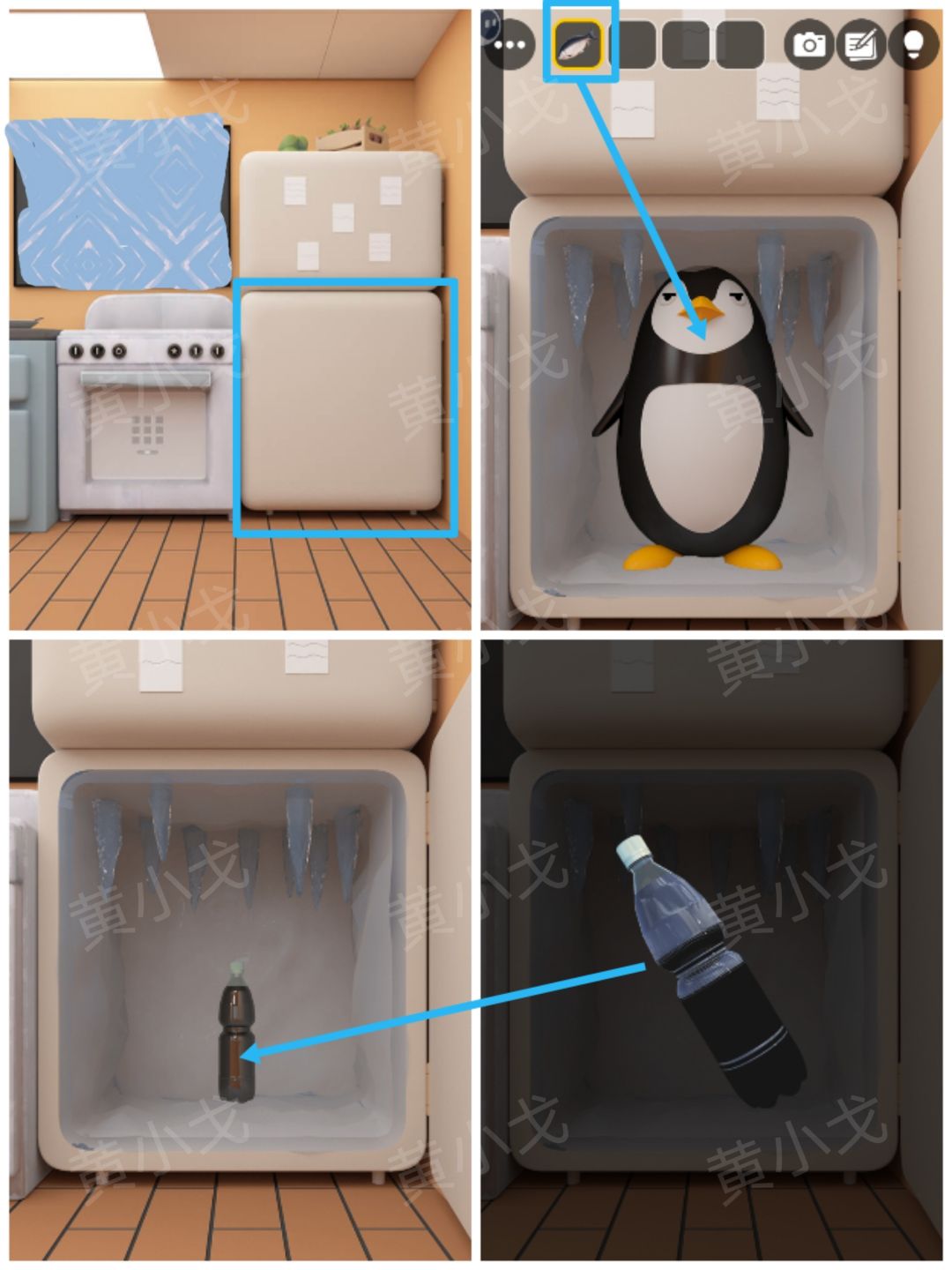 10.打开冰箱冷冻层,拿【鱼】喂企鹅;企鹅走开,获得【可乐】