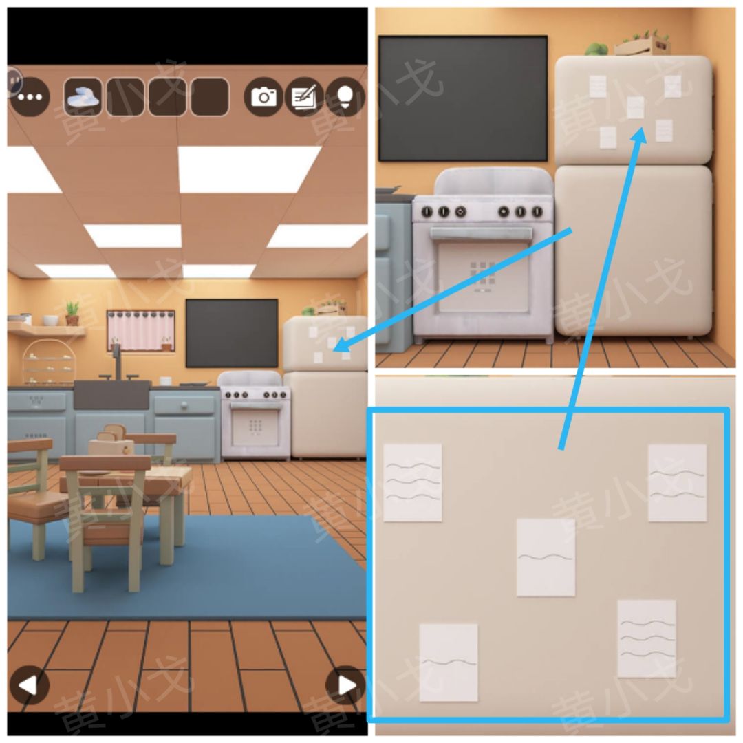 8点击柜子左侧柜门上的密码锁,根据[厨房]场景冰箱门上的纸条线索,调整密码锁