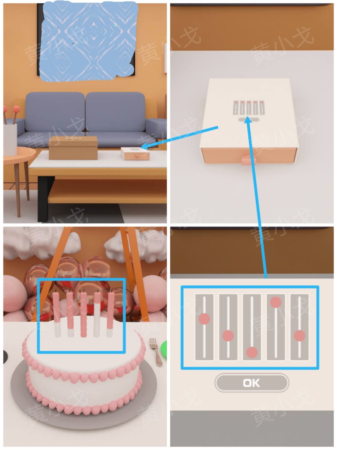16.点击桌子上的白色盒子,根据[派对]场景蛋糕上的蜡烛线索,调整密码锁