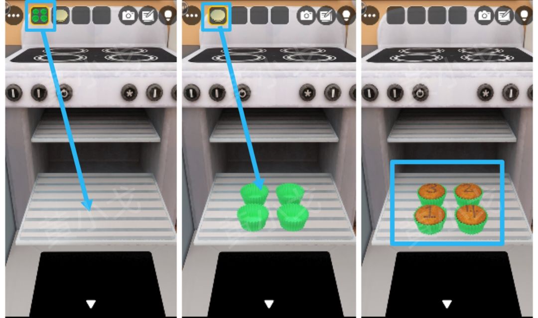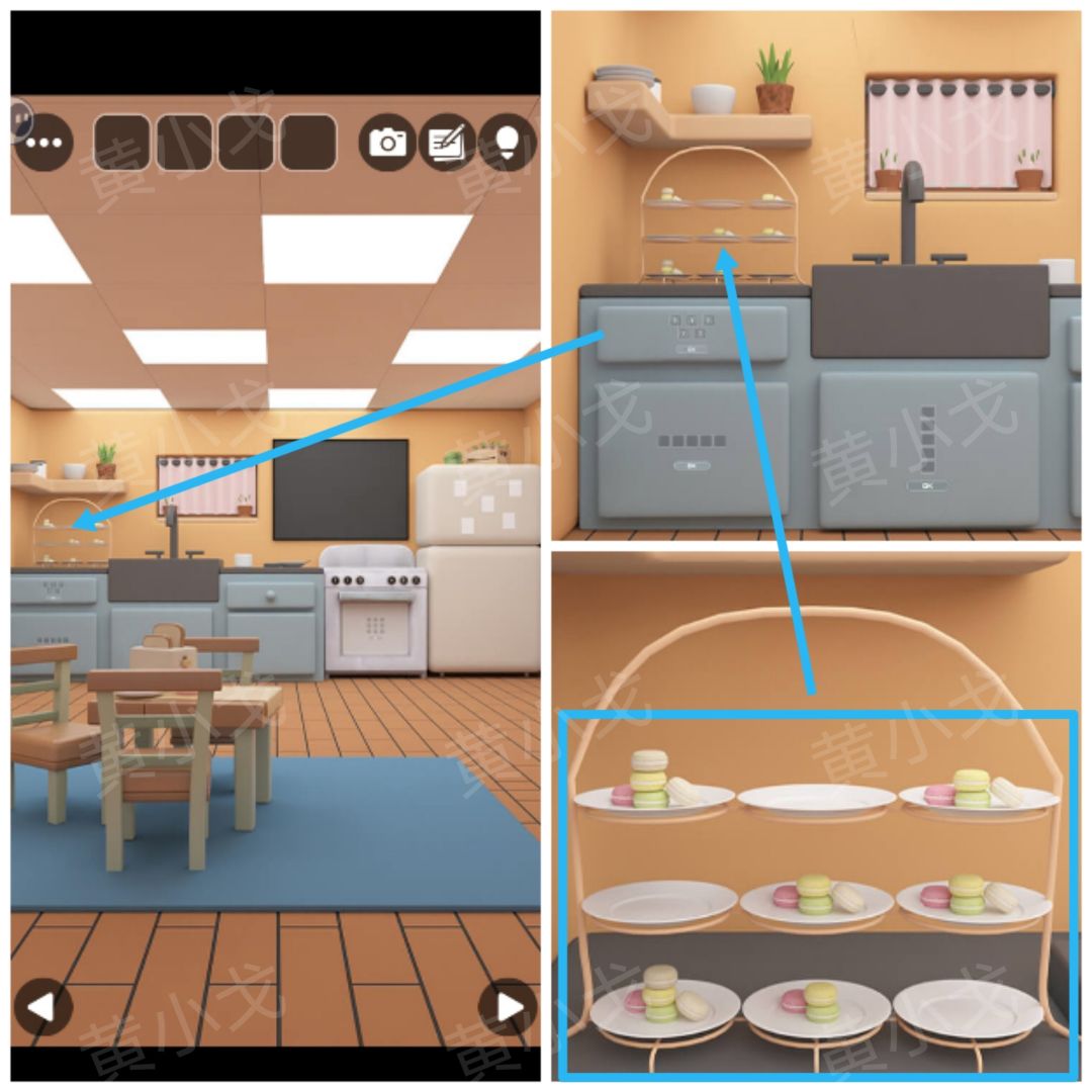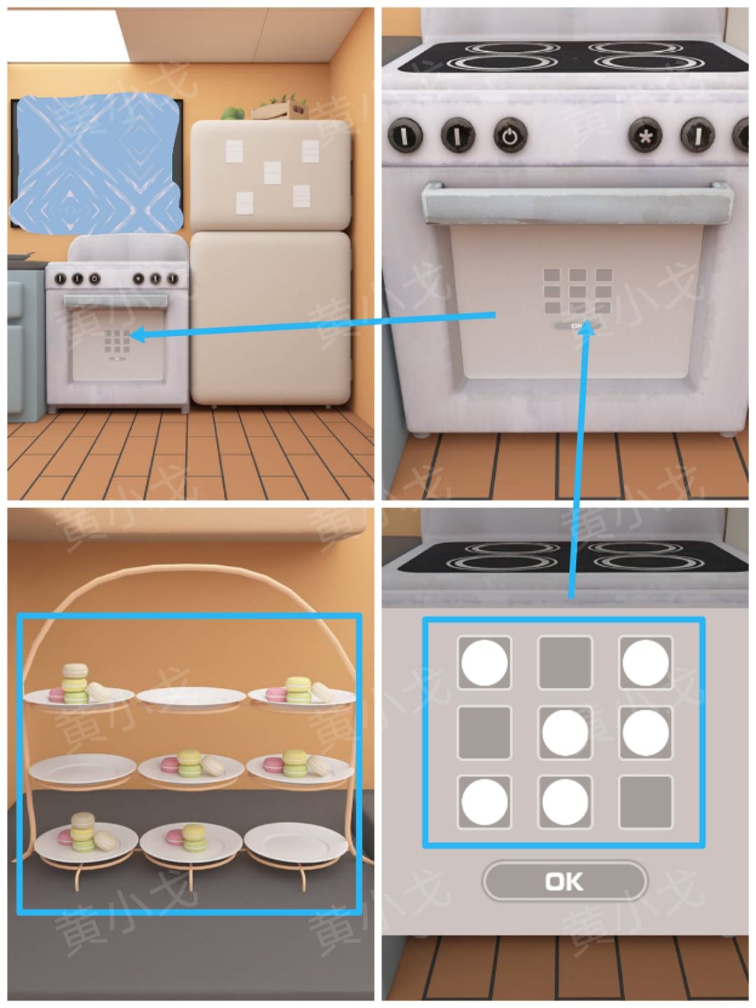20.点击烤箱上的密码锁,根据点心架上装有马卡龙的盘子的位置线索,调整密码锁