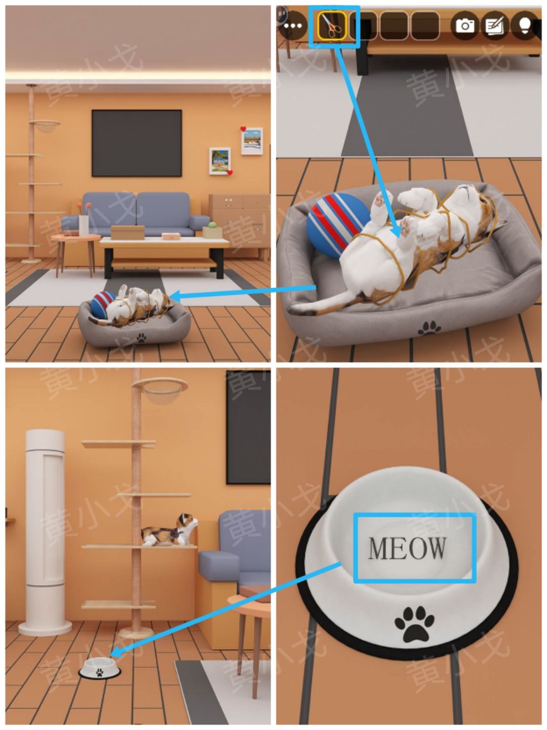 28.点击猫,用【剪刀】剪开它身上的绳子;猫去吃猫粮,查看猫碗,获得线索
