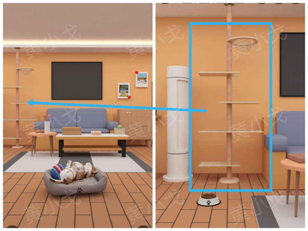 3.点击洗手池下方的橱柜上的密码锁,根据[客厅]场景猫爬架线索,调整密码锁