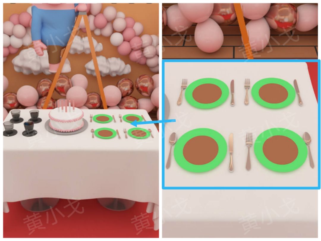 🔶[派对]场景餐盘和餐具的位置:左上-叉刀,右上-叉刀,左下-勺子刀,右下-叉勺子