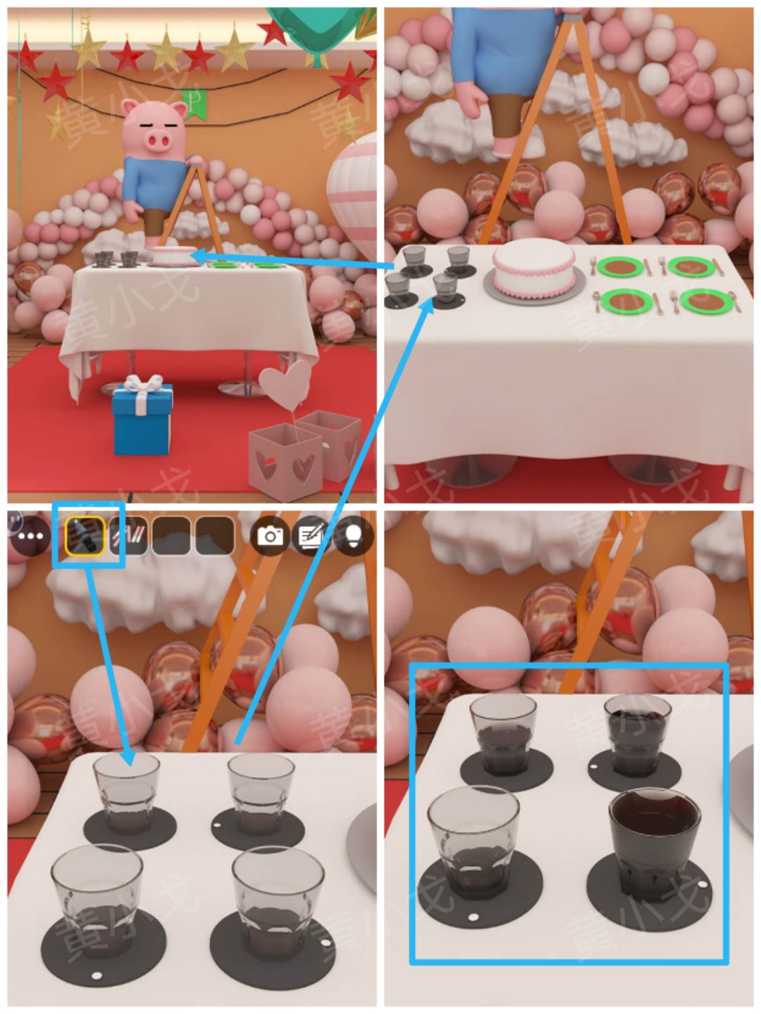 🔶[派对]场景杯子中可乐的量及杯垫上白色圆点的位置(从多到少):右左上下