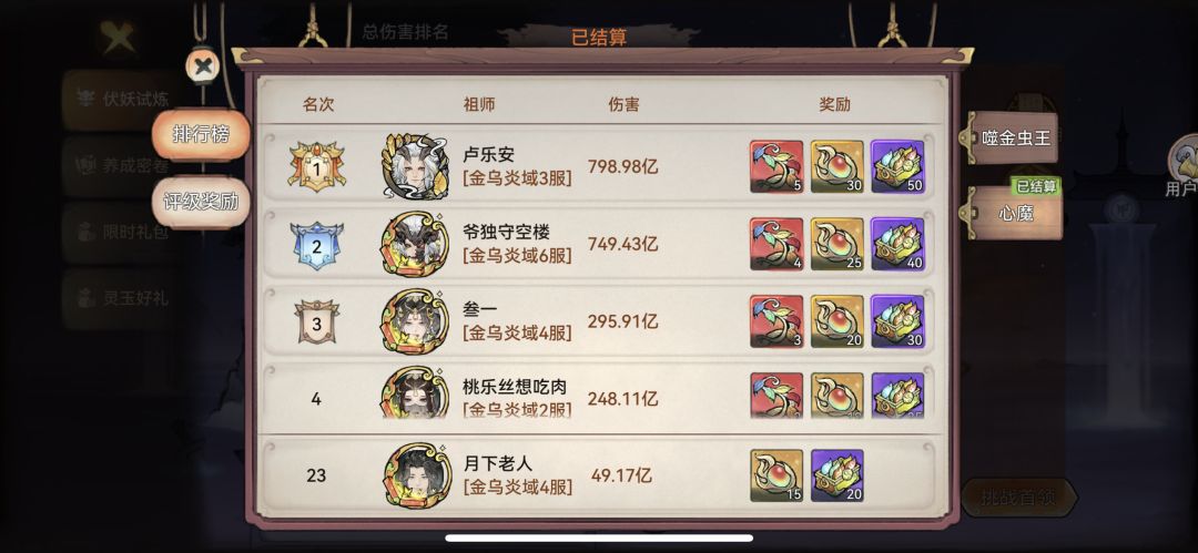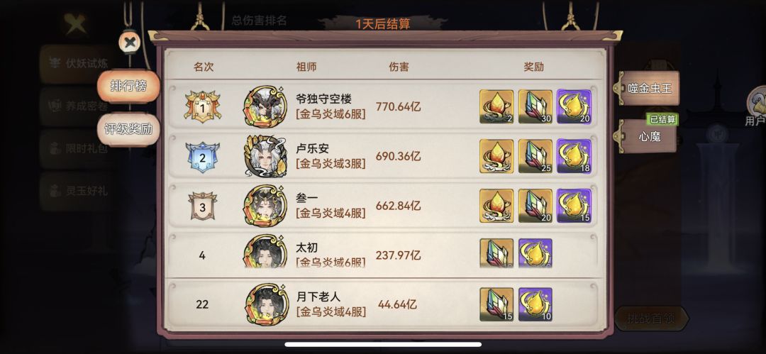 每期伏妖前三的奖励都是大头。