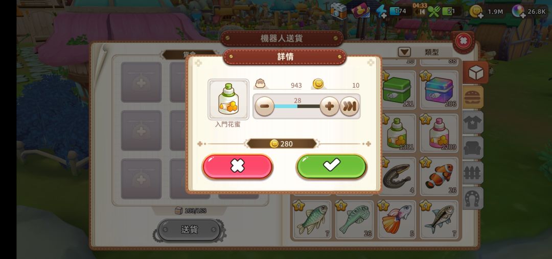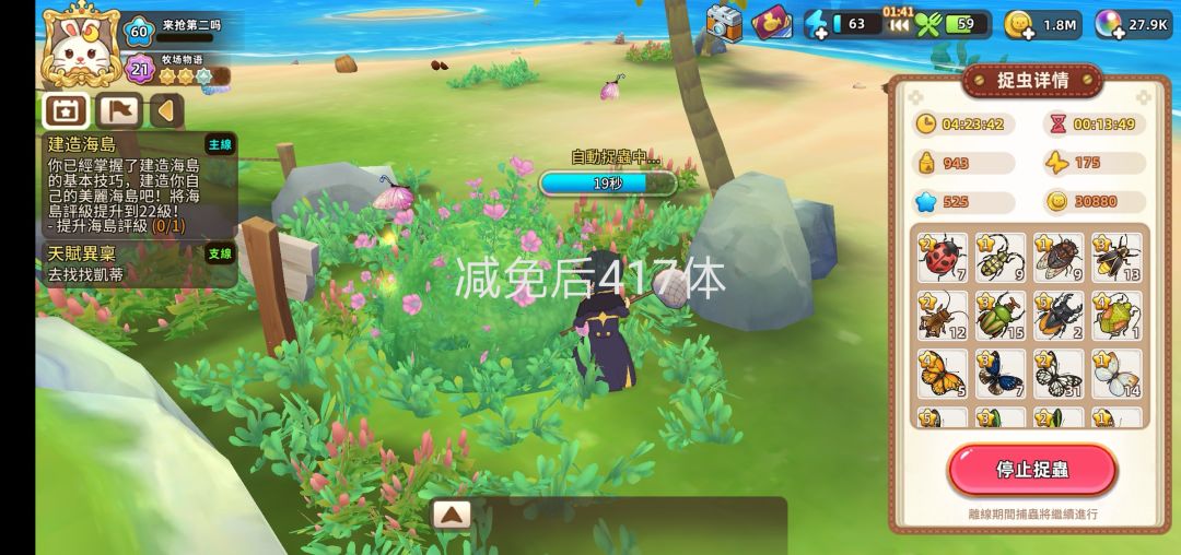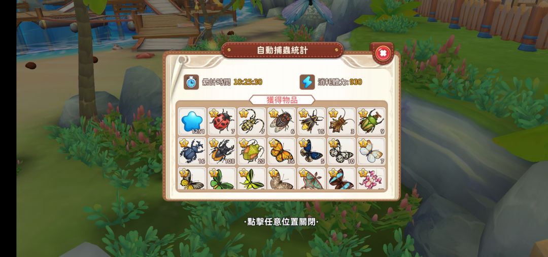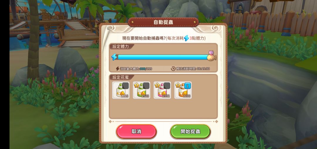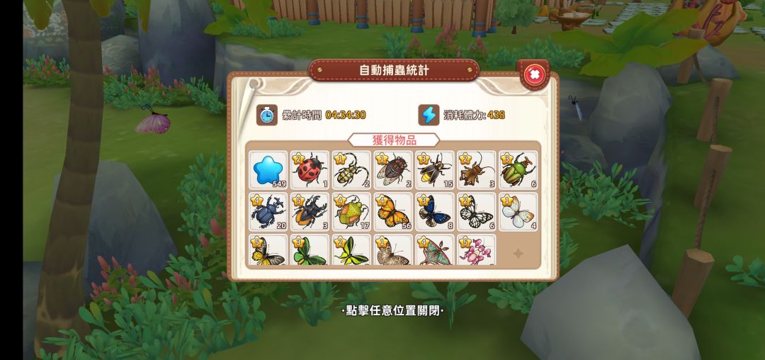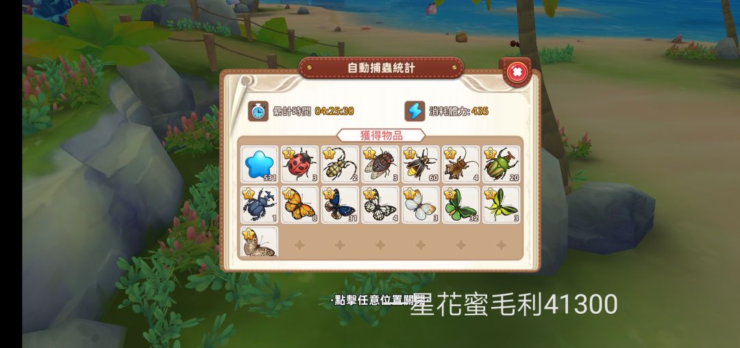 由图可见入门花蜜成本为单个10金币。挂机收益情况为(由于本人手残,准备截图结算情况时不小心误触屏幕,辣鸡m30p没有截图键只能敲屏幕截图,所以只能以水印形式将减免后体力打在图上):