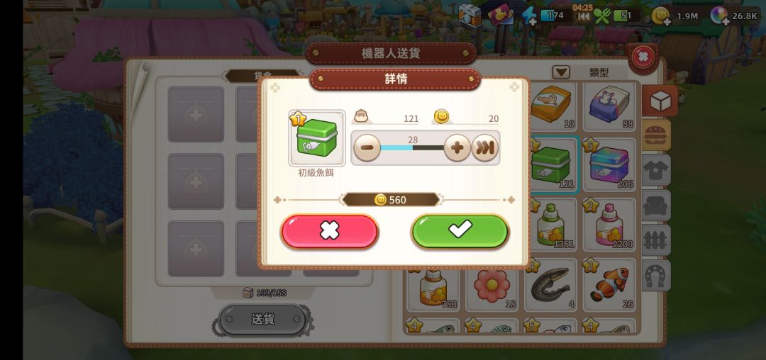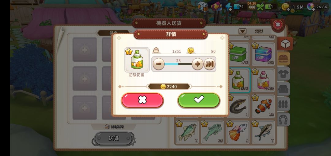 由图可见,女you钓点挂机毛利为116840金币,成本为18*442=7956金币,体力消耗(体力减免折抵)1326点,减免后体力669点,减免体力657点。据此测得: