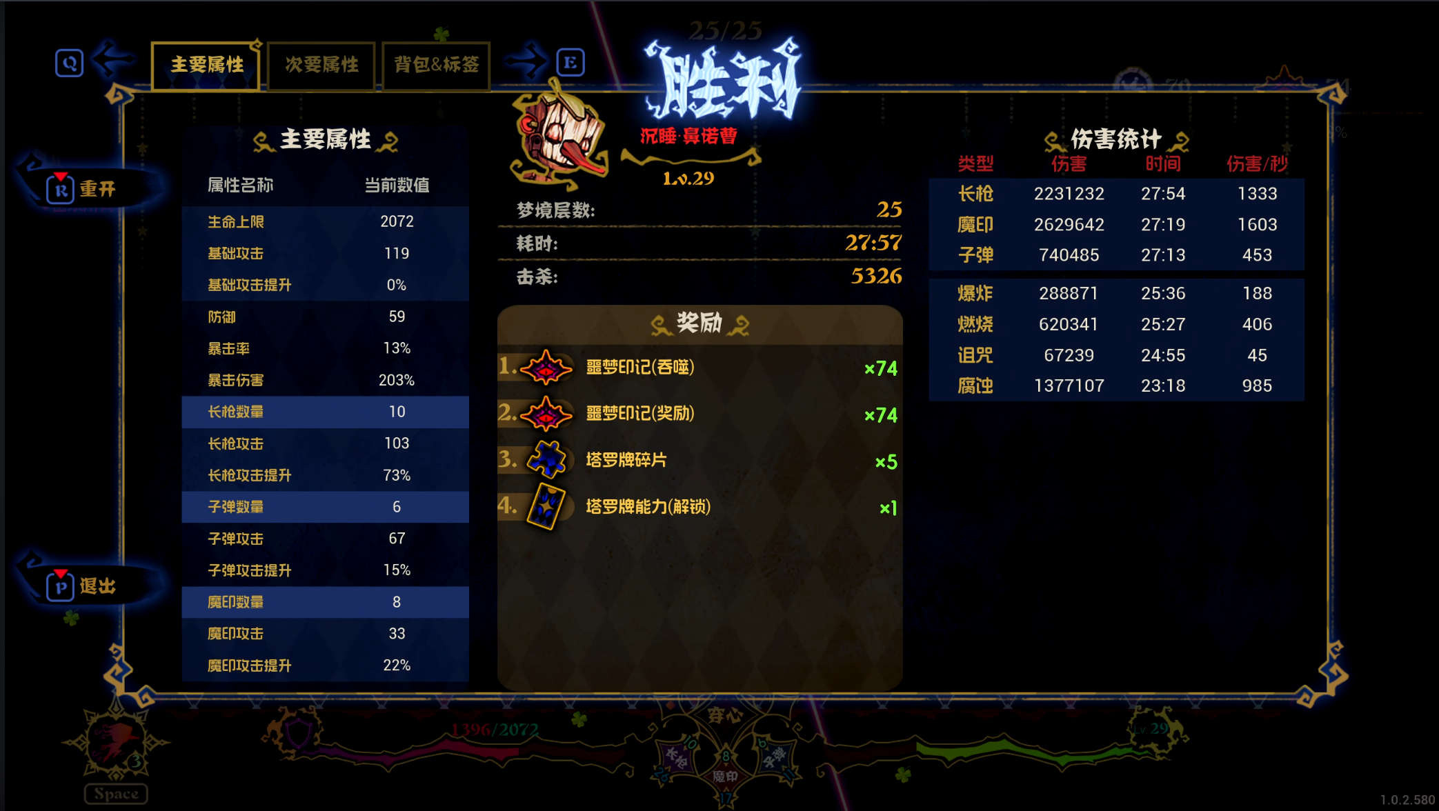 其中恋人塔罗牌的机制很恶心,会分身出另一个攻击力仅为一半的自己,分身被打中本体也会扣血。而且在恋人关卡中打完后出现传送门时,分身不小心靠近也会被传送出去...我连续两次没拿到奖励就被传出去了,很蛋疼!