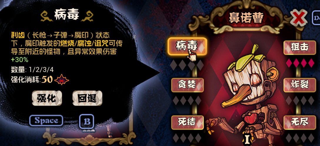 游戏内含有“病毒”、“贪婪”、“死结”、“狙击”、“炸裂”、“无尽”6大武器协同。每种武器协同的生成方式都可以凭借鼠标点击看到。