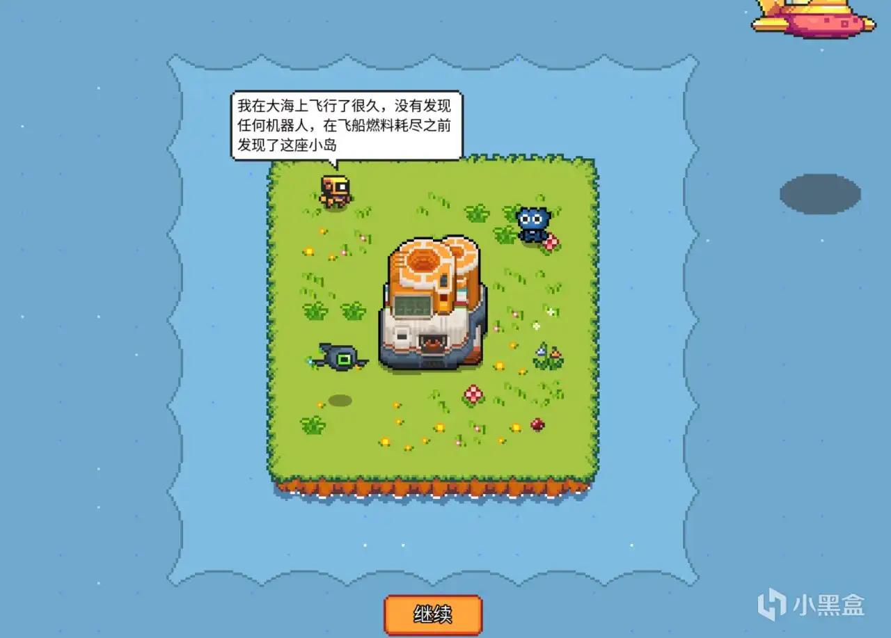 游戏刚开始是一个黄色小机器人驾驶飞机在大海上飞行,由于飞机的燃料快不够了发现了一座小岛并降落在了这里。没想到岛上还有两个小机器人,大家准备齐心协力开拓这片岛屿。