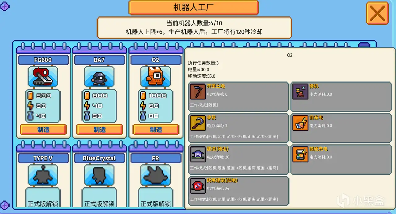 主动能力需要玩家亲自为其分配在能力栏,大致分为“耕地、种植、浇水、收货和建造”。到了中期还可以建造新的小机器人获得新的能力。当我们为小机器人分配好能力后,它便会自动开始建造了。