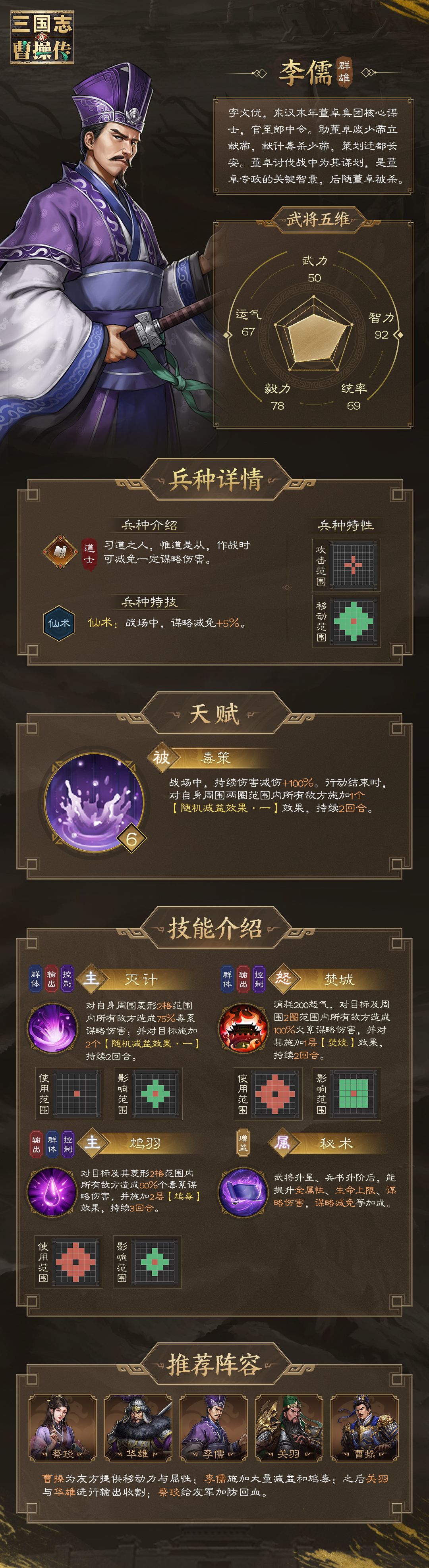 本期来一起看看武将李儒的攻略信息,相信通过这篇攻略,各位英雄能够掌握这名武将的核心战能,夺得战场大胜。
