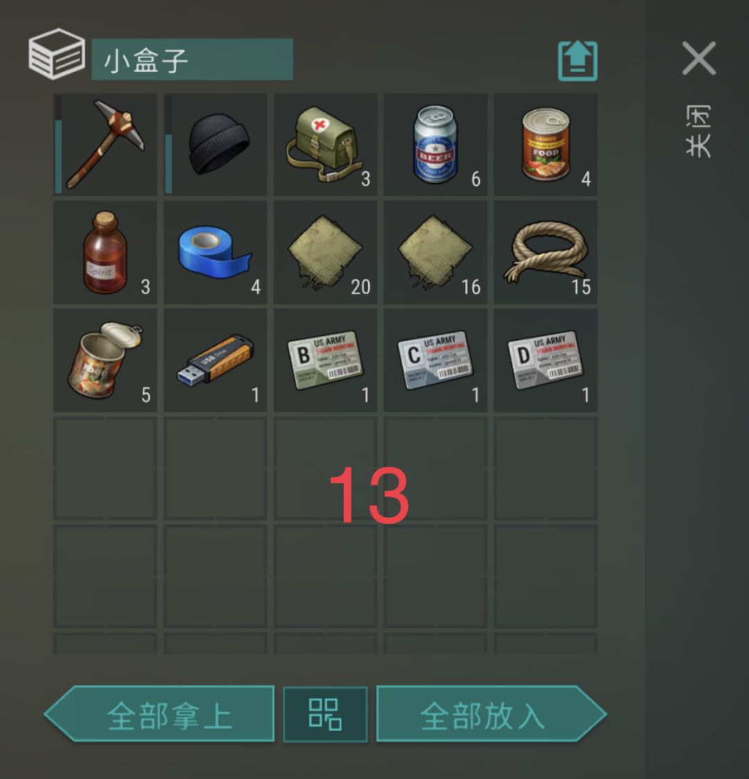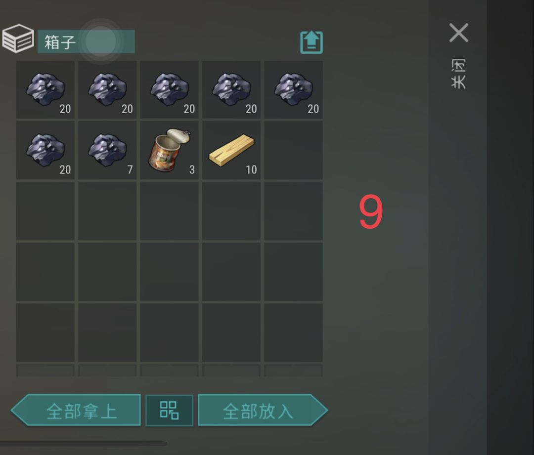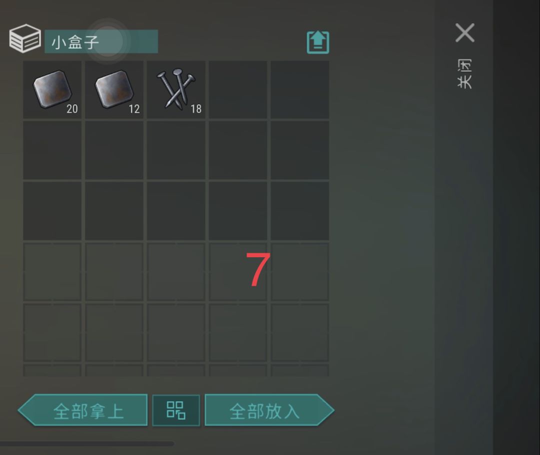 无墙,带小斧头加武器即可,5号空箱,8号1个烟盒