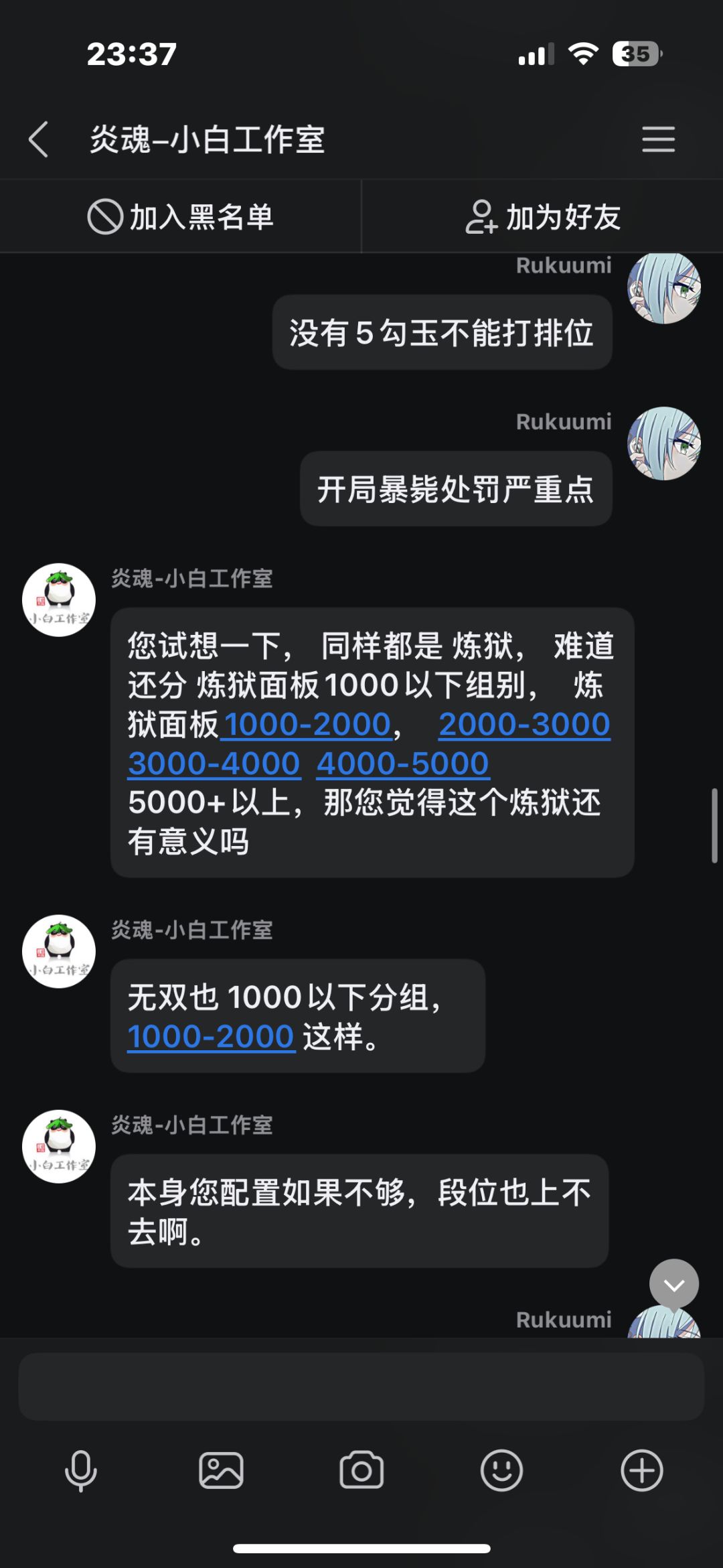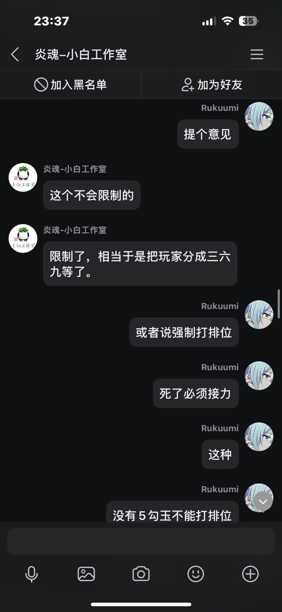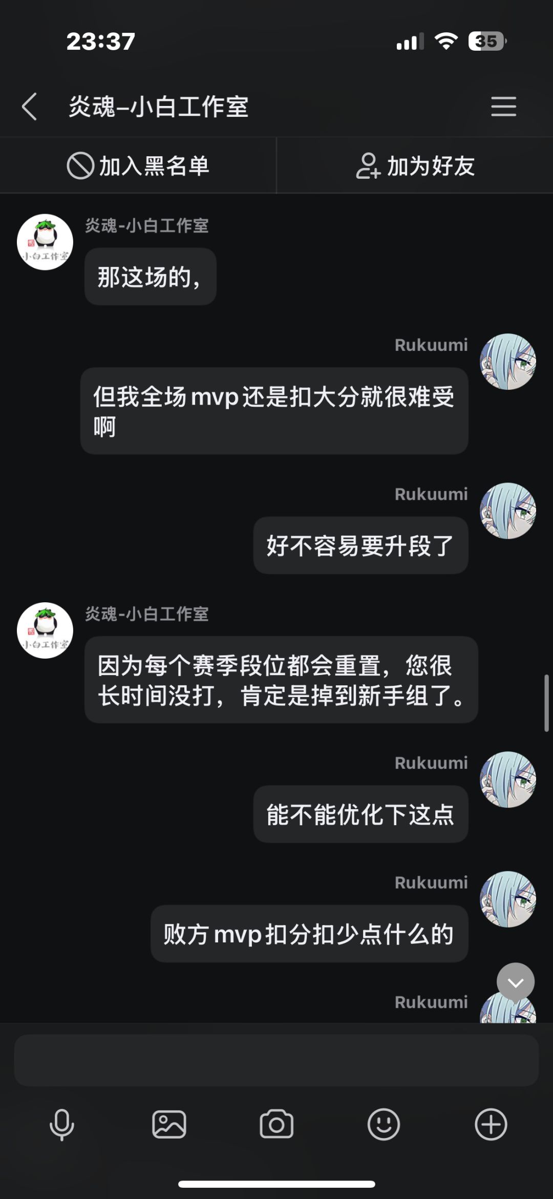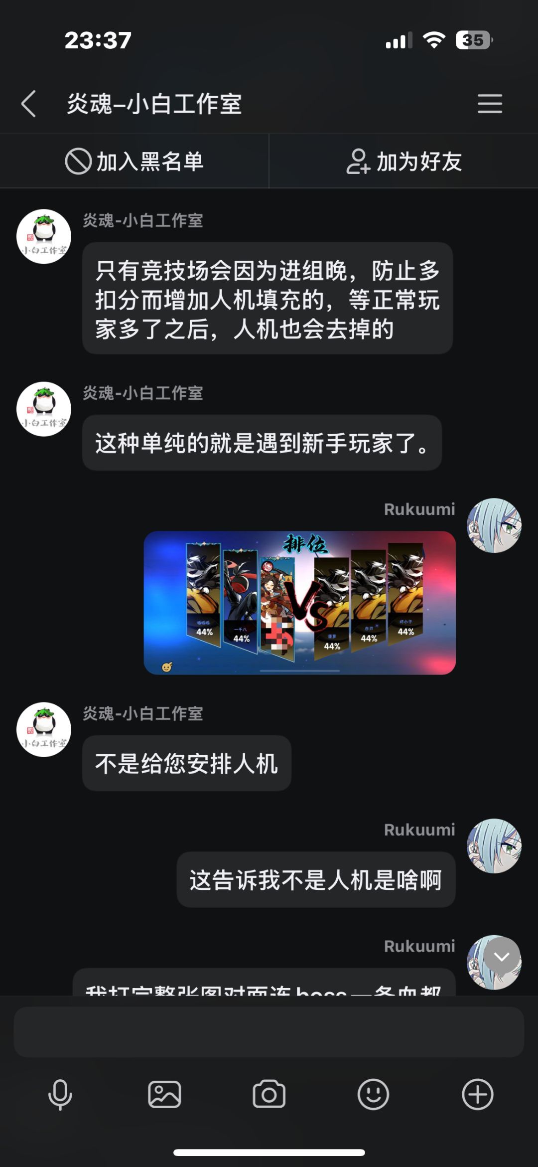 在先前我打了几把排位,中途有个两三天吧,每把都因为队友坑而掉段,我本身也是个回游玩家,打几把排位连续输,后面给我干红温了,结果给我匹配了把人机,跟可怜我一样,我不爽这忍三的扣分机制,就去找客服理论,结果客服不但不安抚我的情绪,反而暗戳戳的戳我的感觉(个人感觉反正让我很不舒服),后面我说了一些我的建议,他给我一一反驳了,给我的感觉也是态度很不好啊,后面我说匹配到五个人机这件事,他硬说这不是人机,我看这点也快下班了,也不想和他多说什么了,这客服我觉得得换换,没有之前态度好了