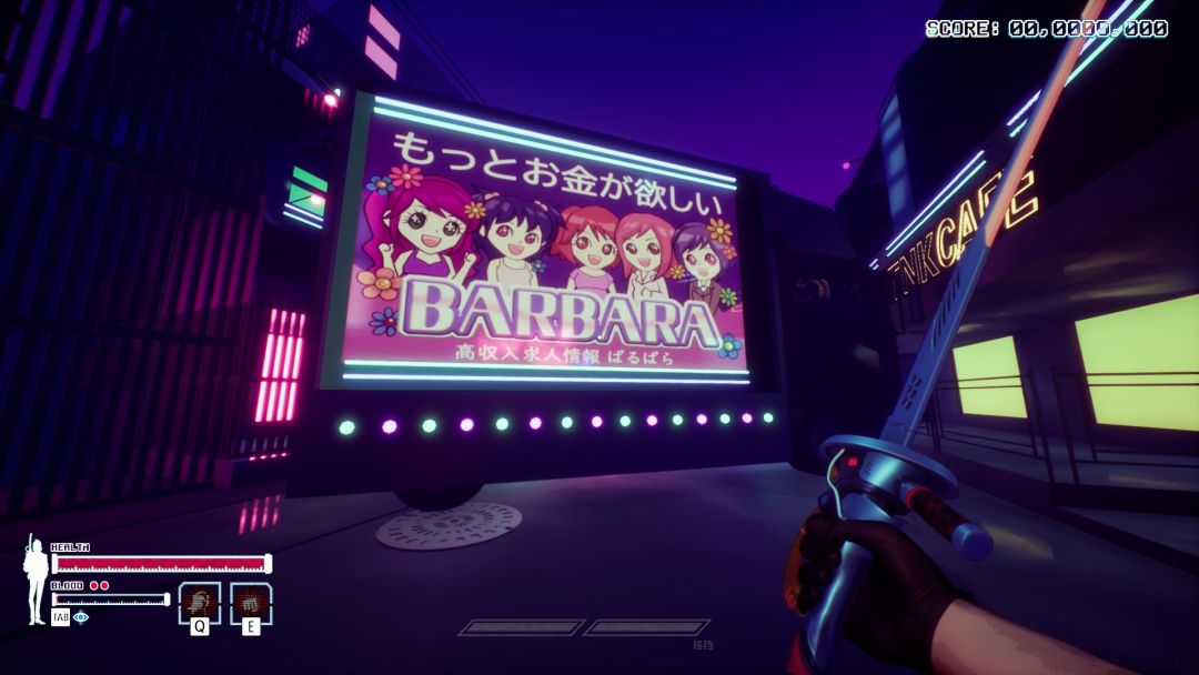 本作是一款具有漫画叙事的第一人称3D版砍杀游戏,故事的开头,讲述了拥有东京吸血鬼称号的小林,为了还清债务,不得不接下各种任务,以此卷入各大帮派的战争,但事情并非那么简单,需要玩家在游戏中自行探索,而初见游戏还以为是2d横版或者是俯视角的肉鸽游戏,但却是像《赛博行者》一样的砍杀游戏,但难度偏低,这样快节奏的第一视角战斗,也带来一个问题,就是容易晕3d,但好在把视角调到最高,关掉动态模糊之后,情况会有所好转。