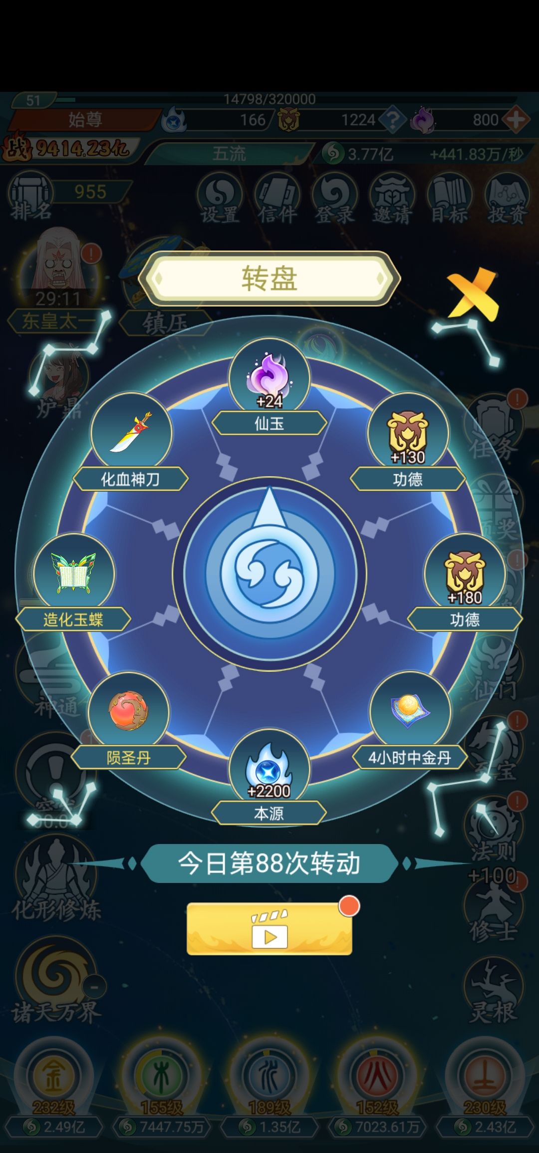 之后又开始刷本源升级至宝和大能等级,基本刷一刷就上前20了,后面功德与仙玉会比较富裕。