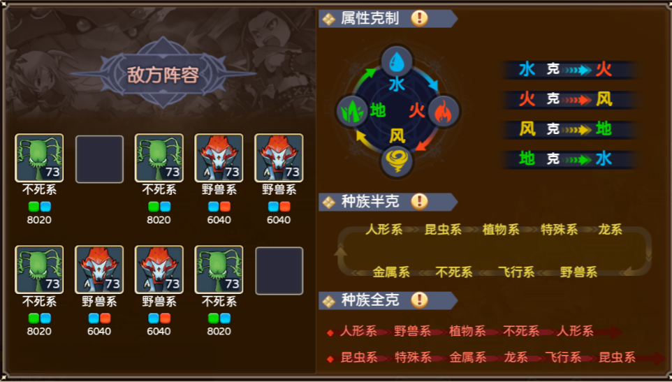 游戏中有种族和属性克制关系,应根据敌方属性选择上阵宠物。例如面对地属性首领 “石巨人”,可携带火元素(无属性)来反制,面对水属性首领 “冰霜女王”,可携带螳螂刺客(无属性)进行克制。