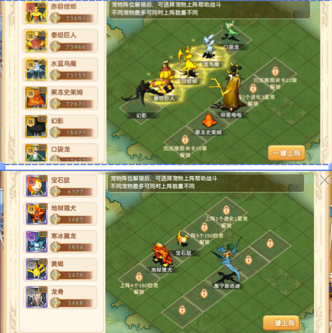 宠物阵位需逐步解锁,解锁一个 150 档宠物可以上阵第一个,解锁二个 150 档宠物可以上阵第二个,解锁三个 150 档宠物可以上阵第三个,解锁四个 150 档宠物可以上阵第四个,上阵一个进化一星宠物可以上阵第五个,上阵一个进化二星宠物可以上阵第六个;上阵一个进化三星宠物可以上阵第七个;完成推图关卡15章上阵第八个;完成推图关卡22章上阵第九个。