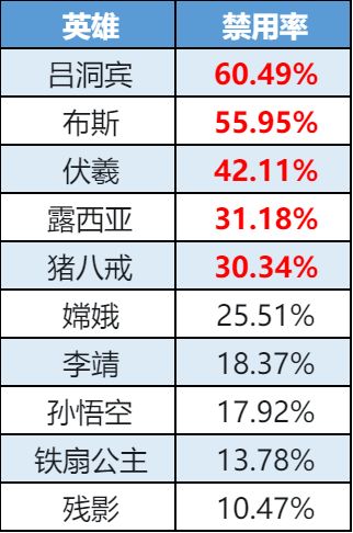 禁用率榜-吕洞宾禁用率终登榜首,伏羲跃升至 TOP3