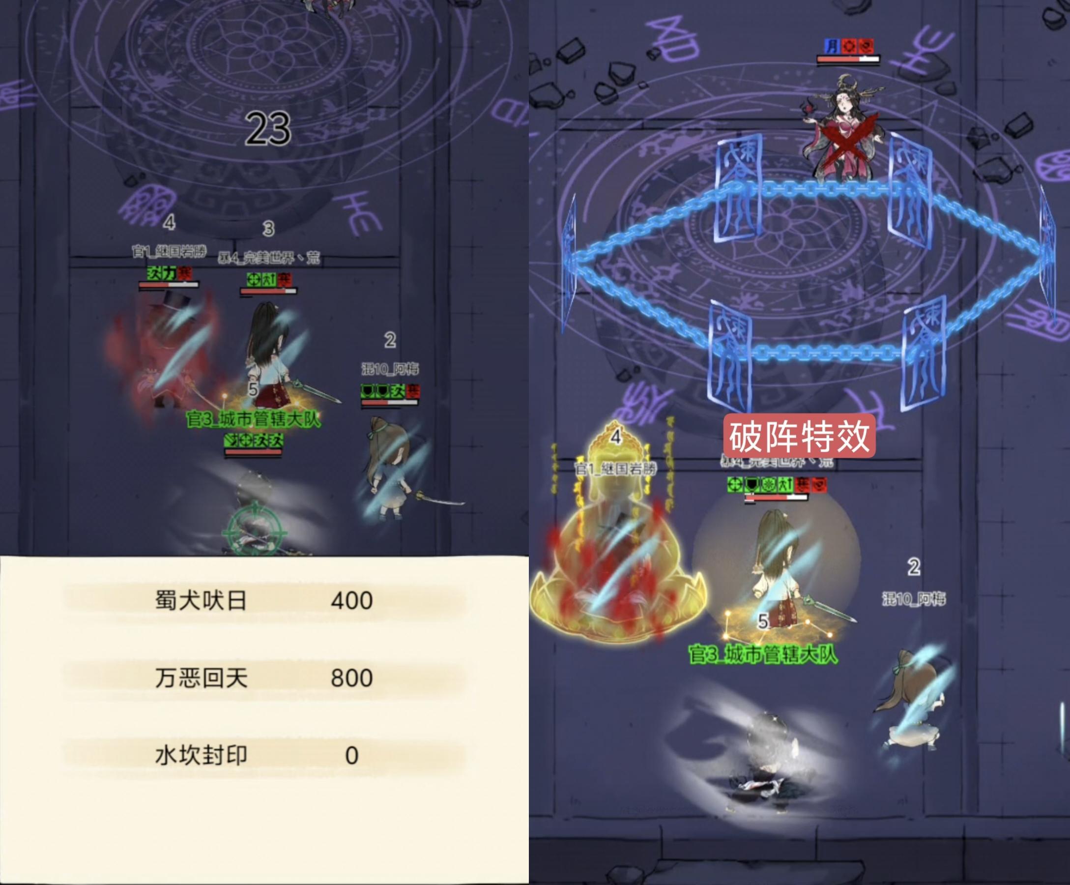 站好阵法之后,队伍里随机一个人(我也不知道是不是随机的,总之每个人都看看)会解锁一个0耗技能,你必须要释放这个技能,然后就可以破解阵法。(必须得在两回合之内破阵!否则永远都无法破阵,只能输。换句话来说,你在两回合之内都是有机会破阵的。):