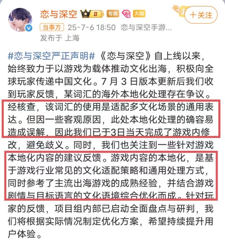 “游戏内容的本地化,是基于游戏行业常见的文化适配策略和通用处理方式,同时参考了主流出海游戏的成熟经验,并结合游戏剧情与目标语言的文化语境综合优化而成。”