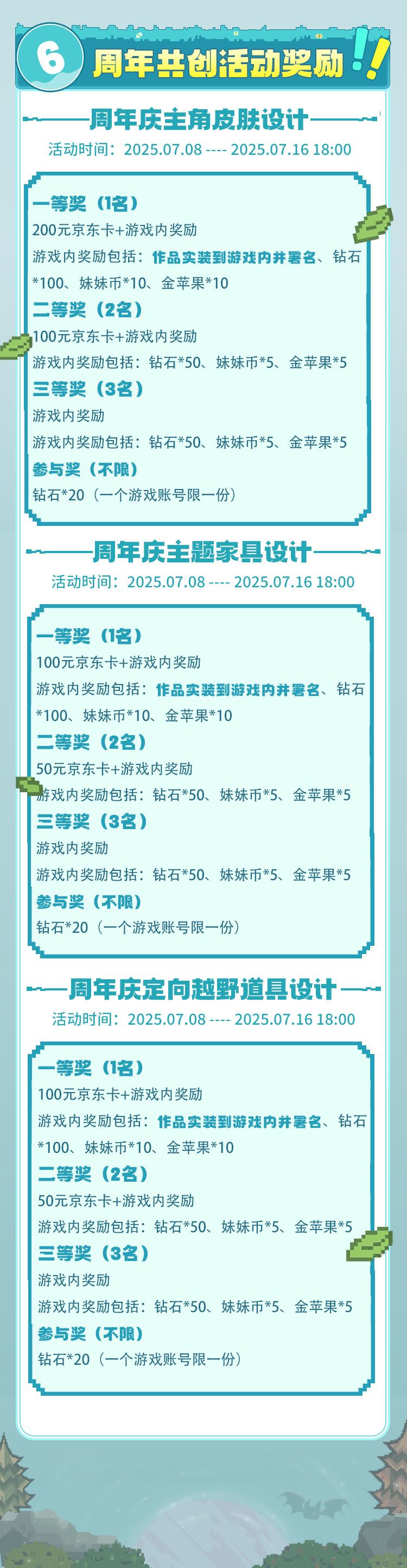 本次创作活动分为周年庆主题主角皮肤设计比赛、周年庆主题家具设计比赛、周年庆主题定向越野道具设计比赛三个赛道: