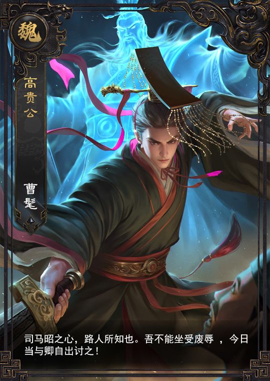 这张帝卡以曹魏第四位皇帝曹髦为主角,精准复现了其“傀儡天子抗权臣”的悲壮人生。从开局被司马氏派系笼罩的困局,到 “毌丘俭讨伐司马师”“诸葛诞之叛”等历史本纪的触发机制,再到“司马昭之心”本纪中九锡加身的权臣逼宫,每个技能都深植于正元、甘露年间的权力斗争。特别是抗争失败后魂穿司马衷操控八王之乱,以“咒怨值”“傀儡附身”等机制,将曹髦的不甘与怨念转化为可以实操的游戏体验,历史沉浸感堪称一绝。