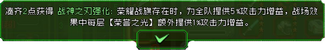 - 战场中每多1层荣誉之光,额外提升攻击力1%;