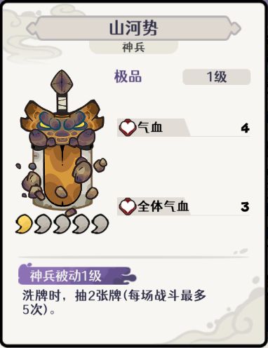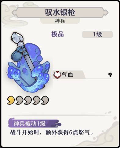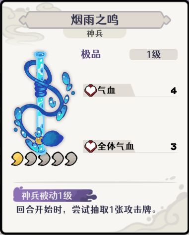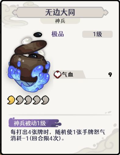 水元素的通用悬壶,真气技和神兵被动都是怒气相关,专属卡牌「星罗棋布」可以快速检索到关键卡牌,使套路更加流畅。