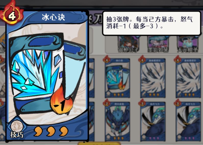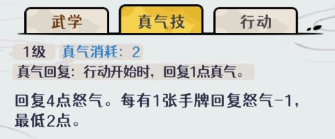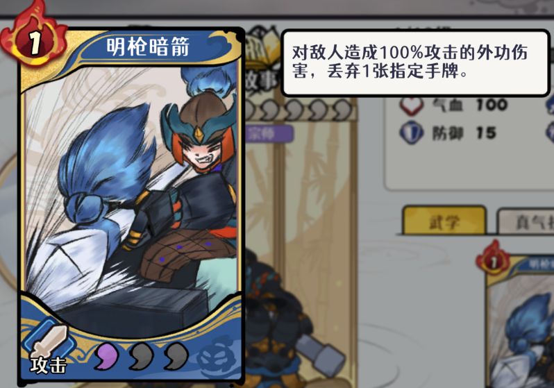 水元素的通用豪侠,神兵被动是额外获得怒气,十分通用。真气技是基础的加护甲。专属卡牌「明枪暗箭」只需1怒,可配合各种弃牌卡牌,比如丢弃「追月飞刀」时可获得2张「飞刀」。