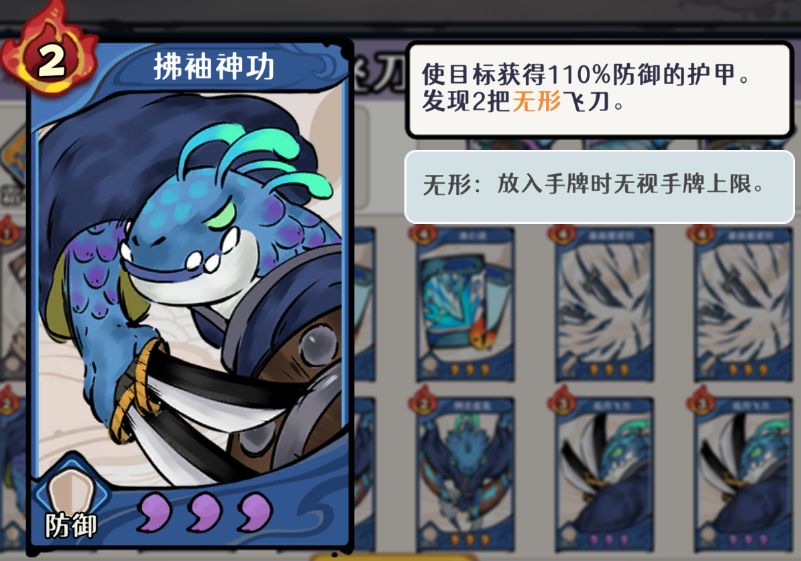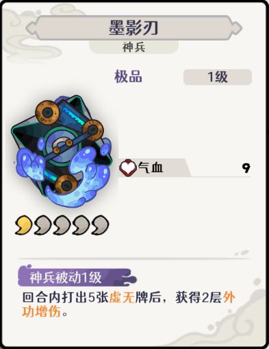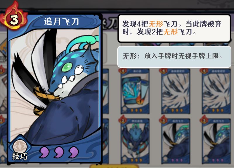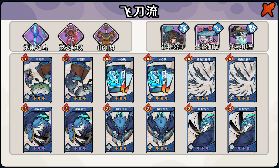 「飞刀流」的核心是在一个回合内尽可能多地打出卡牌「飞刀」。「墨影如黛」的专属卡牌配合真气技,可以免怒气打出飞刀。同时,由于发现的飞刀都是「虚无」牌,所以很容易出发神兵被动,获得外功增伤。