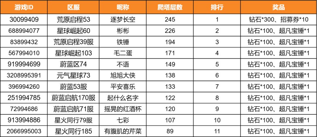 开奖啦ヾ(◍°∇°◍)ノ゙恭喜以下国王们获得本期爬塔挑战赛的活动奖励!一起来看看吧~