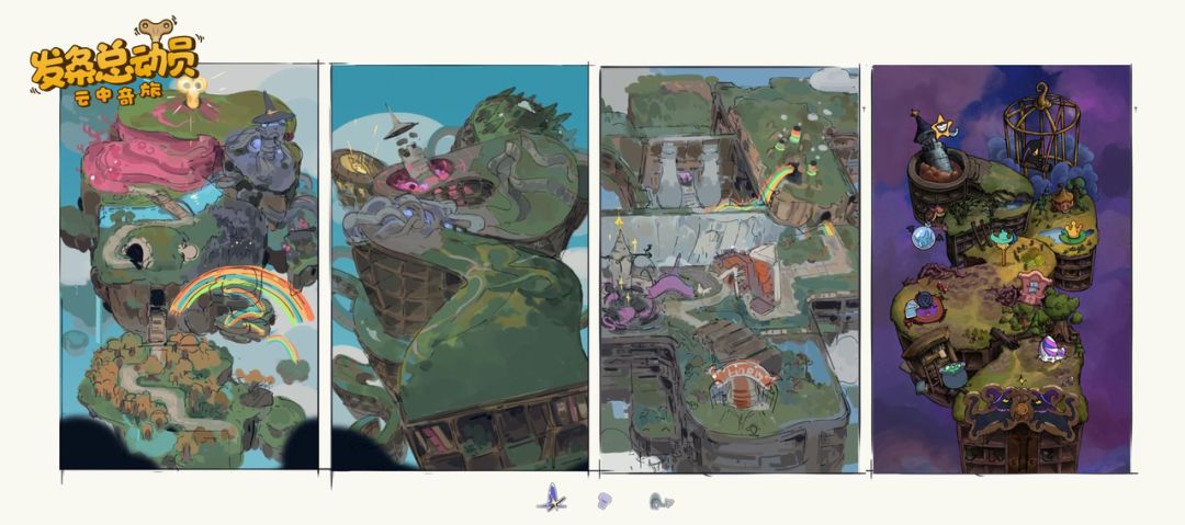 在地图设计中,我们为每一章地图精心设计了独特的主题,并将主题元素与橡皮管风格深度融合。例如,第五章“魔女庄园” 作为一座悬浮空中的奇幻岛屿,其实藏着我们对“庄园”的一次大胆重构——打破大众印象中稳坐大地的固有模样,将它抬升至半空,又用夸张扭曲的植物、怪诞诡谲的建筑与奇幻魔法元素层层包裹。这种“离地而起”的设定,恰好与橡皮管卡通风格特有的魔幻、夸张感相互呼应,让奇幻气质从视觉中被自然解读。