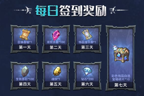 每日签到,福利不断。从基础养成资源到彩色饰品,为勇者们量身定制了每日资源获取途径!