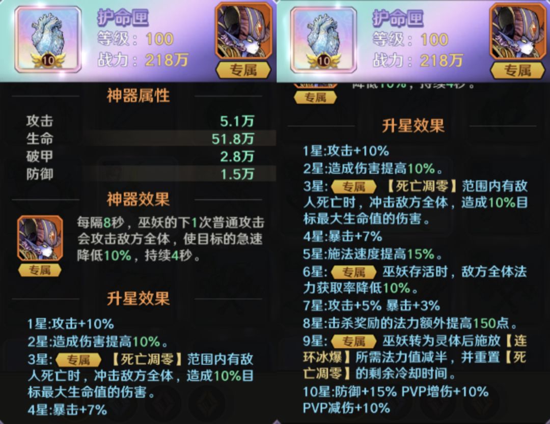 专属效果1:【死亡凋零】范围内有敌人死亡时,冲击敌方全体,造成10%目标最大生命值的魔法伤害。