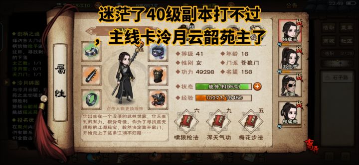 萌新玩这游戏好迷茫啊,想玩剑仙来着,百度说叛门三连苍狼太乙泠月,我进苍狼了刚开始磕钢筋铁骨。随从不知道配啥武学(攻略和wiki里没找到,百度里的搞不到比如烈阳神掌,我的柳如意啊