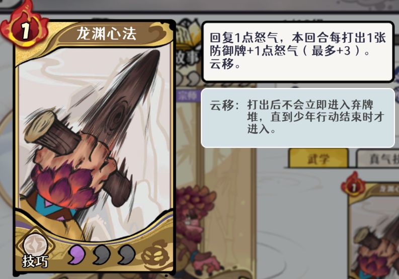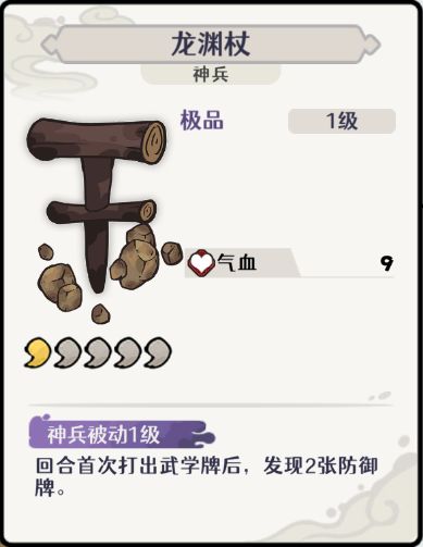 神兵被动和专属卡牌「龙渊心法」都与防御牌相关,十分适合「爆牌流」。而且专属卡牌是十分难得的增加怒气的卡牌。